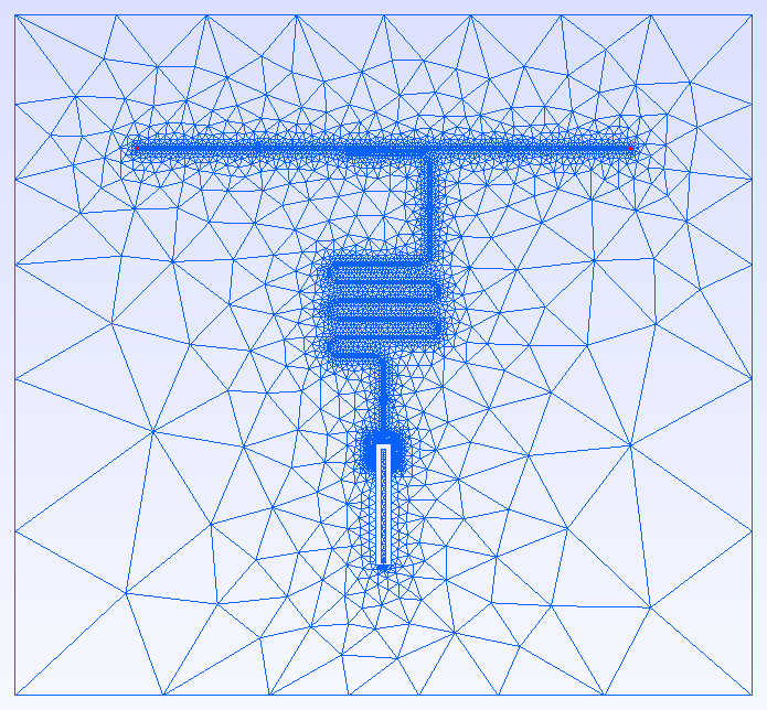 SolidModels.gmsh.fltk.run() # Opens Gmsh GUIBelow, we show the mesh for the metal surfaces. You can also (barely) see the lumped ports at the ends of the readout line in red.